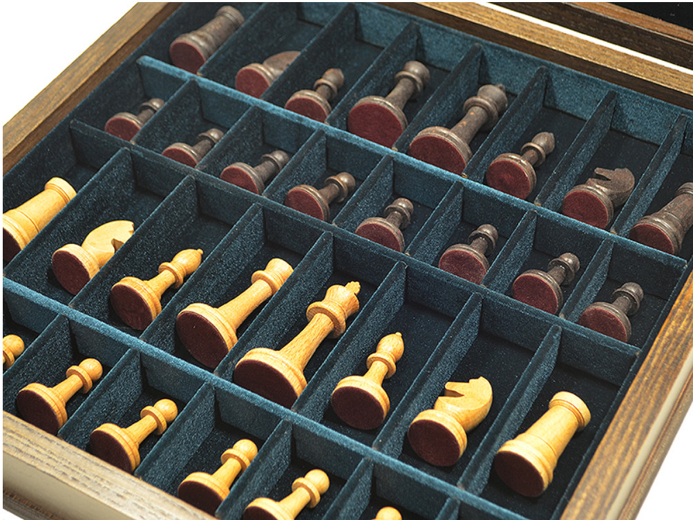 Шахматный ларец выполнен в технике маркетри с использованием шпона ценных пород дерева. Высококачественная фурнитура. Внутреннее пространство ларца отделано качественным итальянским бархатом и оснащено удобными углублениями для бережного хранения фигур.