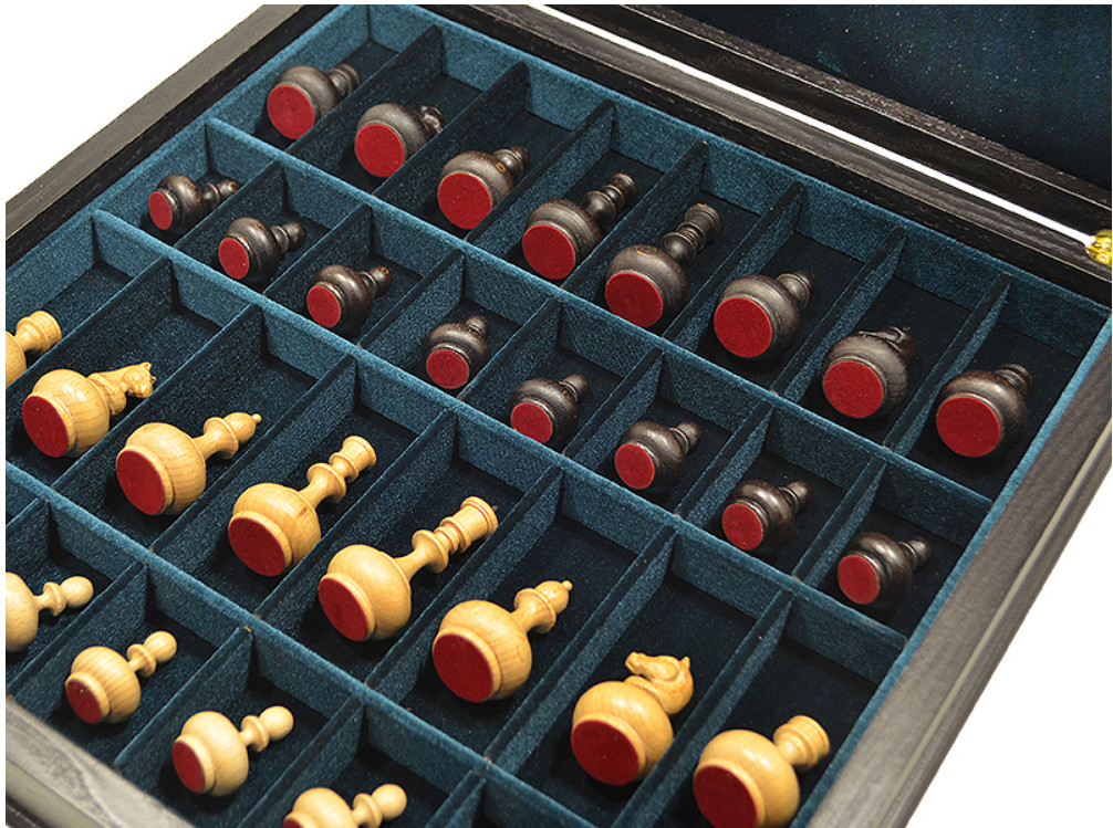 Шахматный ларец выполнен в технике маркетри с использованием шпона ценных пород дерева. Высококачественная фурнитура. Внутреннее пространство ларца отделано качественным итальянским бархатом и оснащено удобными углублениями для бережного хранения фигур.
