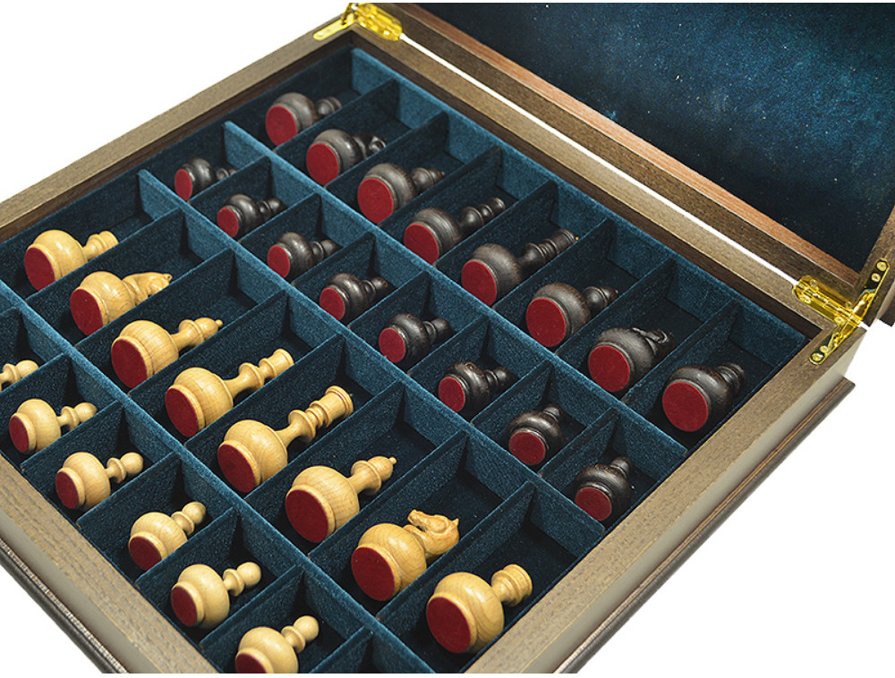 Шахматный ларец выполнен в технике маркетри с использованием шпона ценных пород дерева. Высококачественная фурнитура. Внутреннее пространство ларца отделано качественным итальянским бархатом и оснащено удобными углублениями для бережного хранения фигур.
