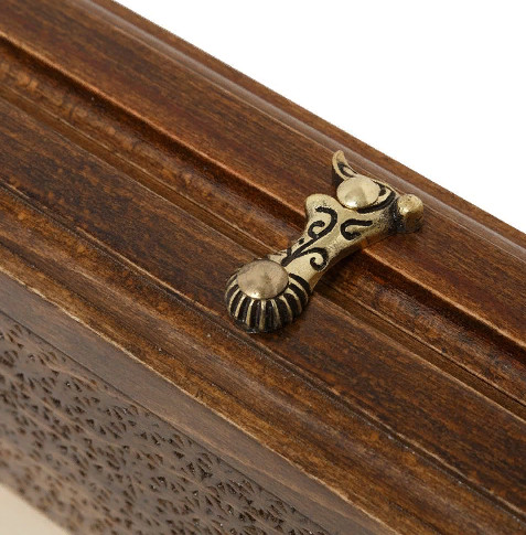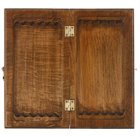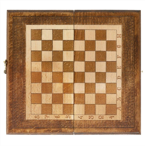 Фигуры небольшие, но тщательно проработанные, король 6 см. Фишки идут в классическом исполнении без подложек. Внутри набора размещено поле для шашек. Петли изготовлены из бронзы, что обеспечивает надёжность.