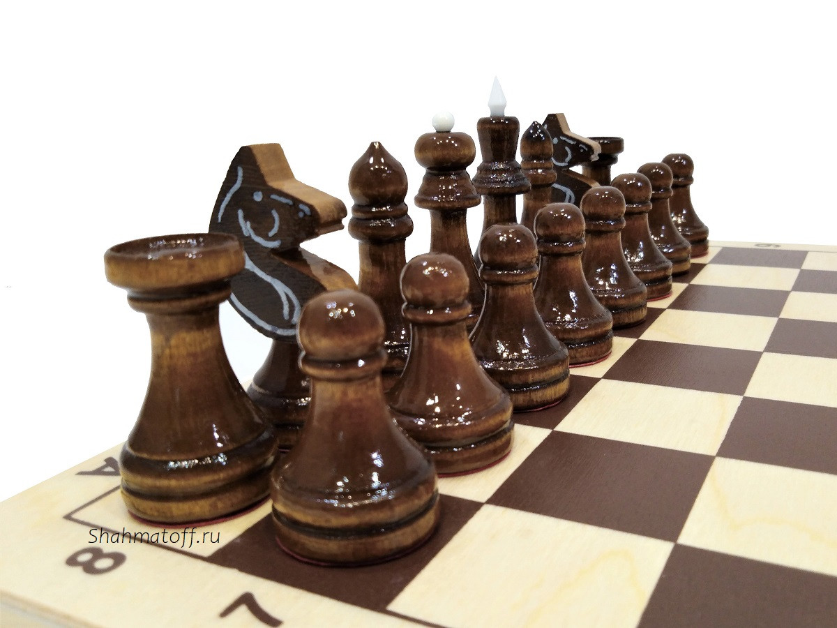 Шахматные фигуры: лакированные, с бархатной подклейкой основания.