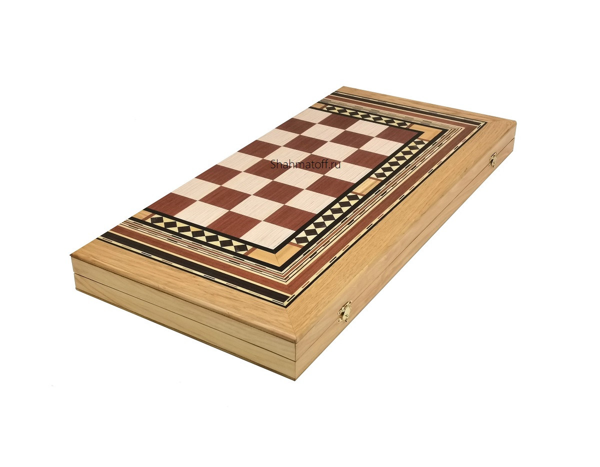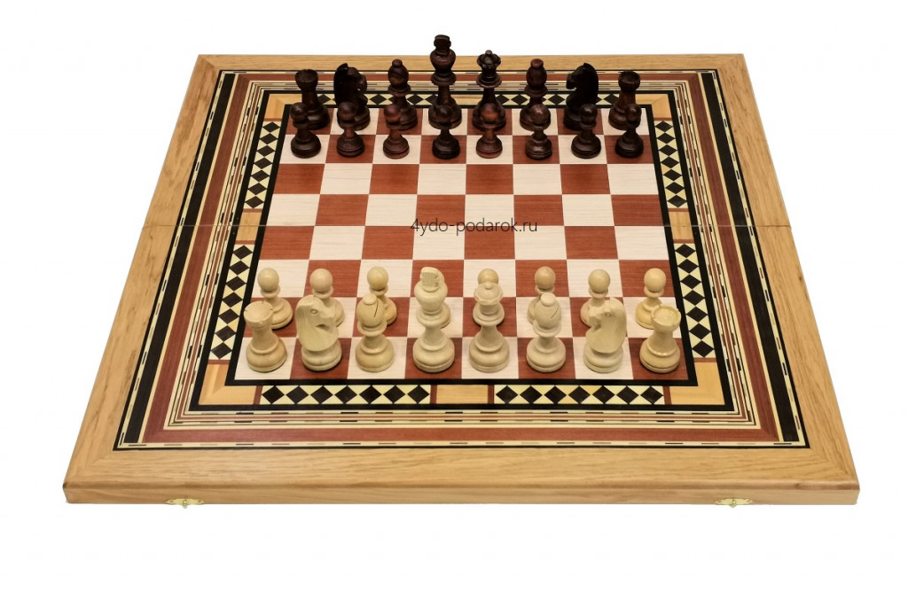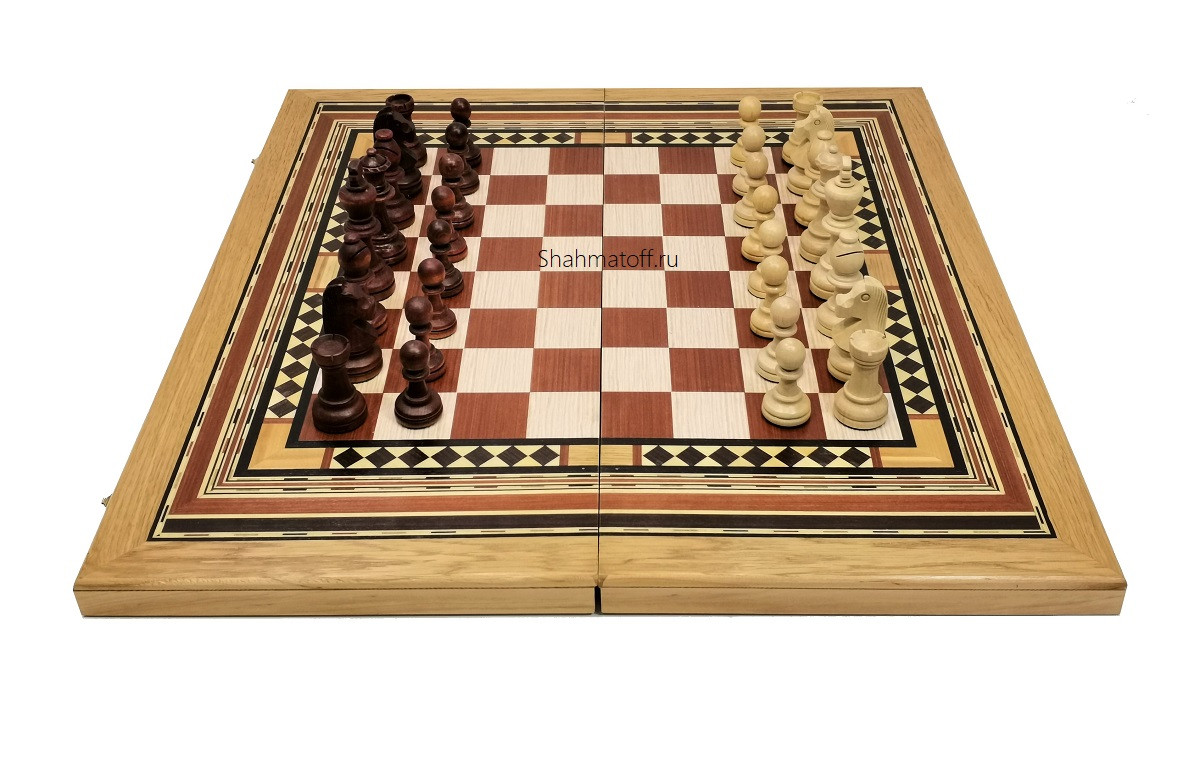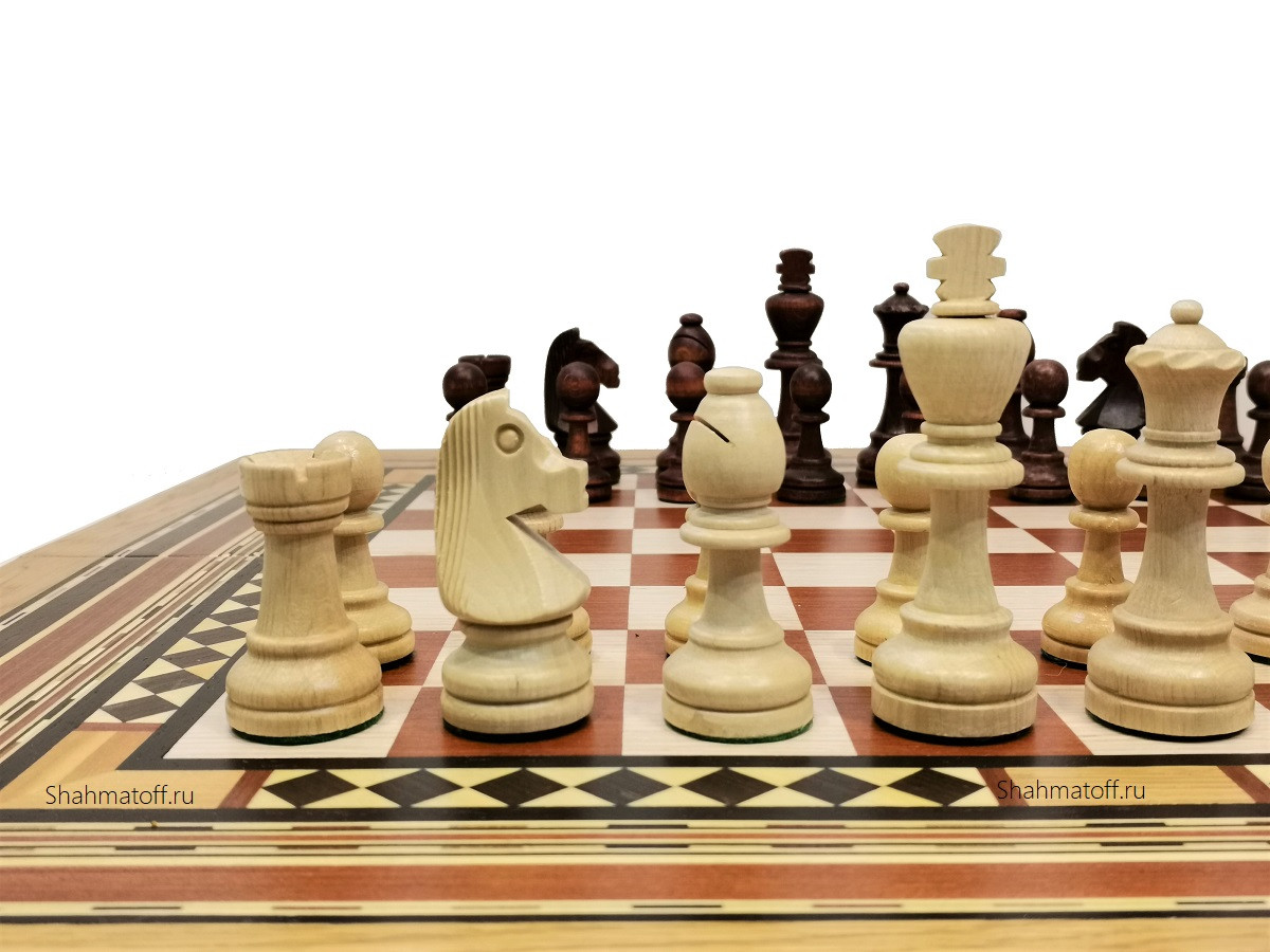 Узорная мозаика шпоном из ценных пород дерева придаёт игровому набору геометрическую эстетику точности и красоты, а бесшумная и уверенная постановка подклеенных и утяжелённых фигур доставляет истинное наслаждение при игре.