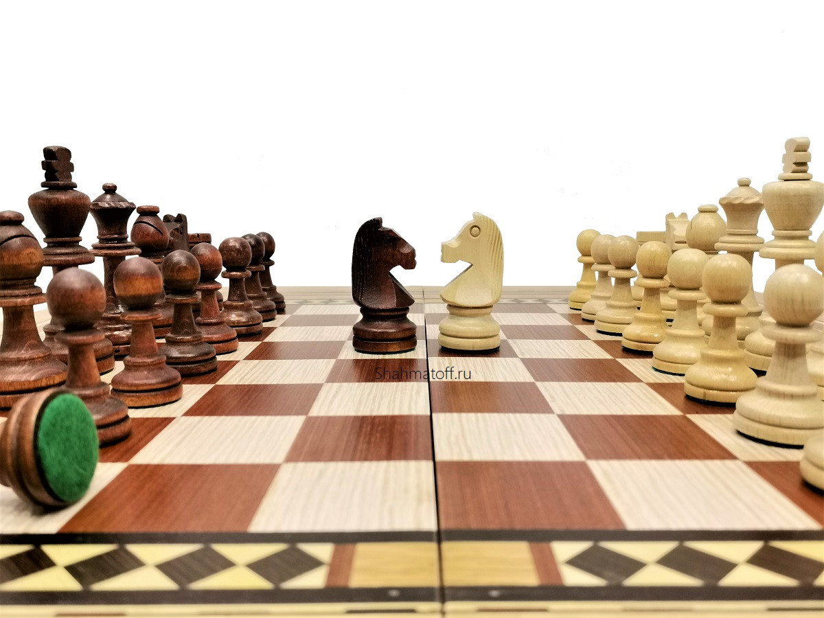 Специфика выполнения фигур: Шахматные фигуры профессиональные дизайна Стаунтон 7 - утяжелены и имеют в основании тканевую подклейку, что позволяет обеспечить сохранность игрового поля. Покрытие фигур полуматовым лаком исключает появление бликов, что придаёт удобство во время игры.