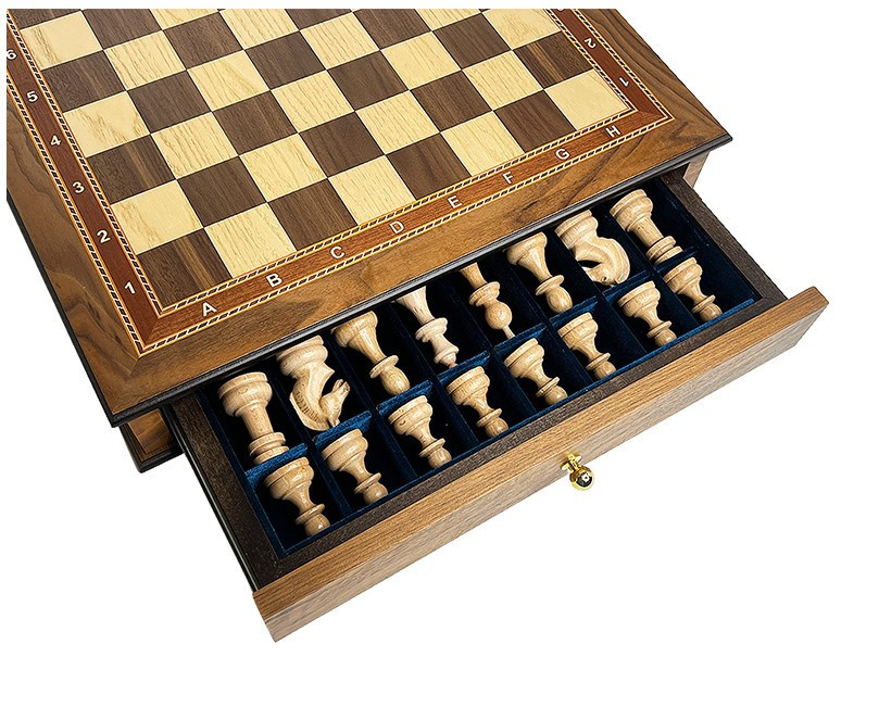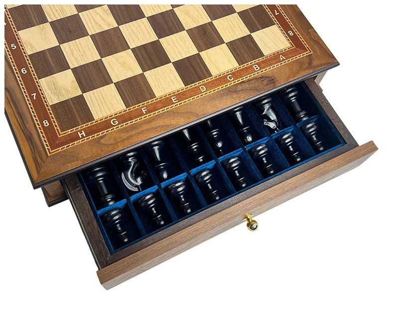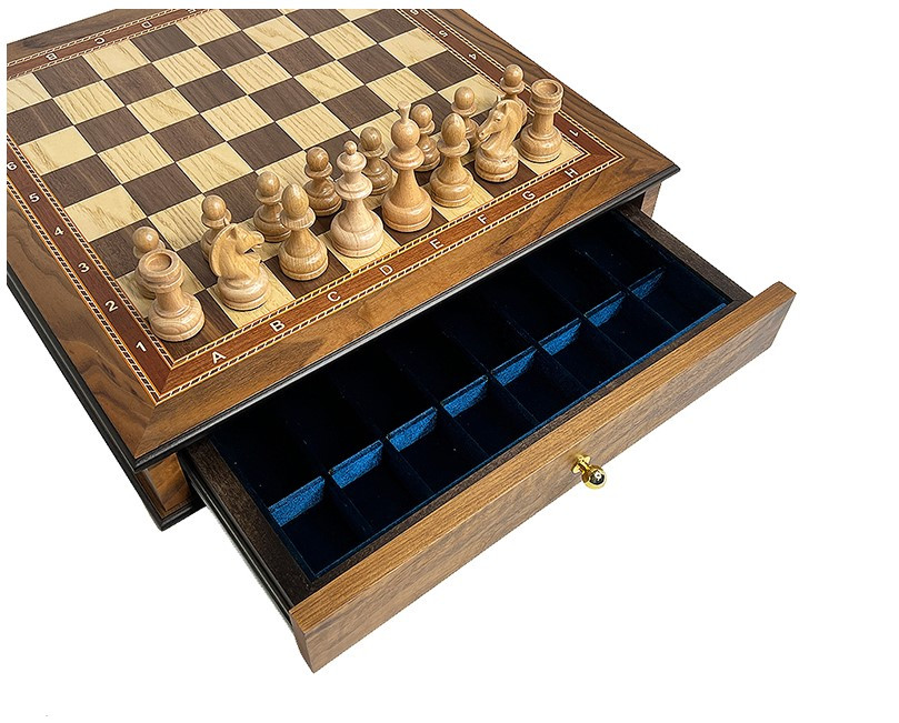 Во внутреннем пространстве ларца имеются выдвижные ящички с бархатными ячейками под каждую фигуру.