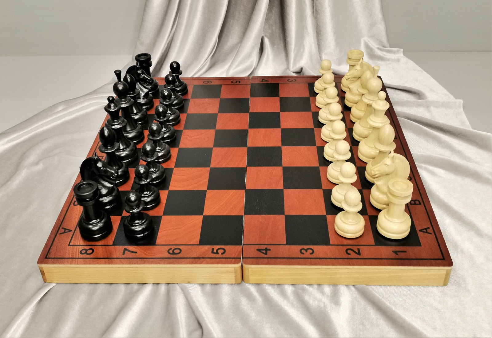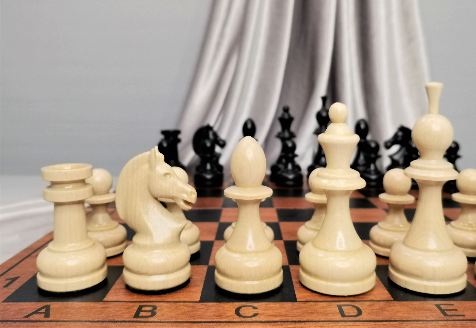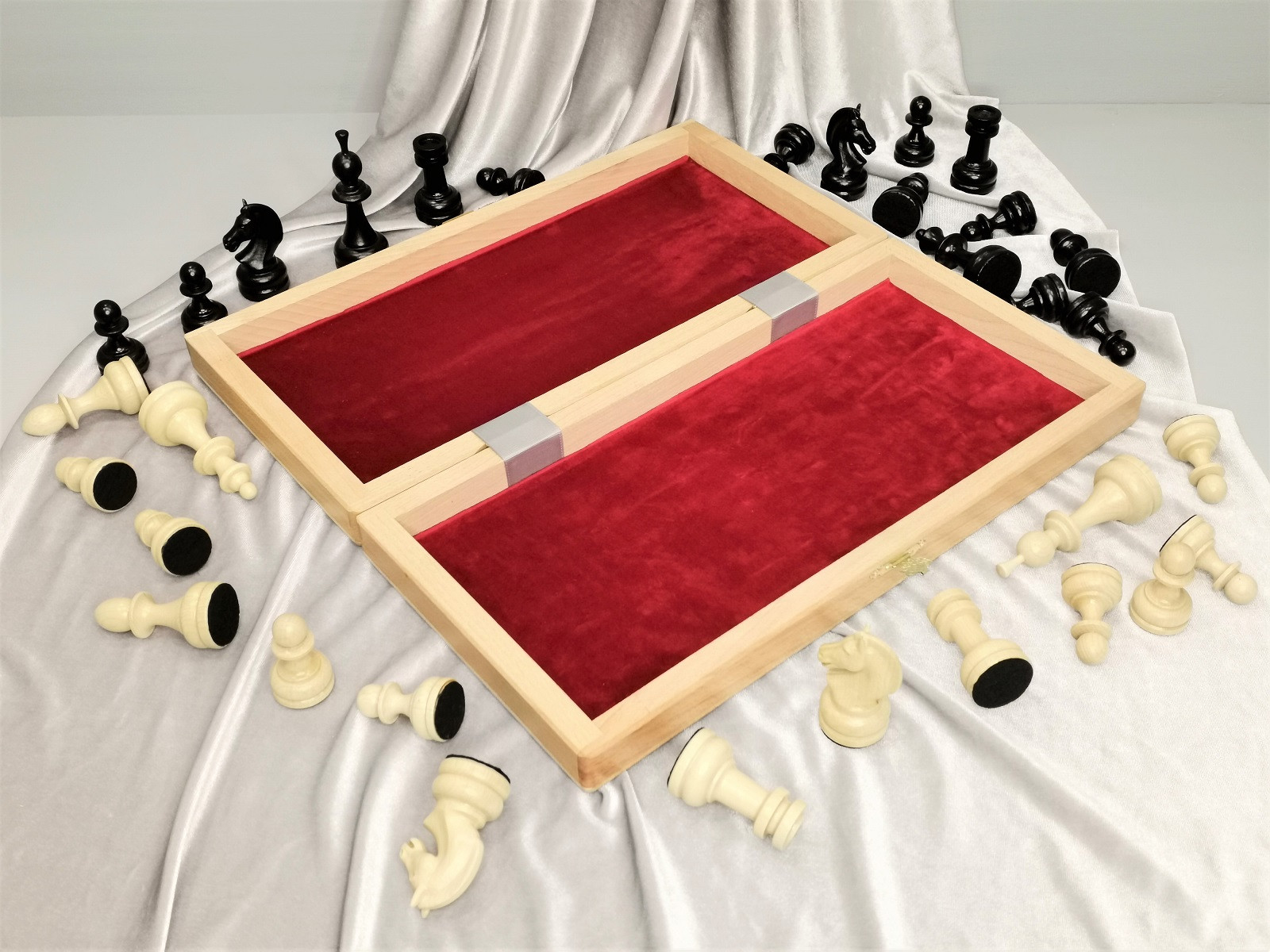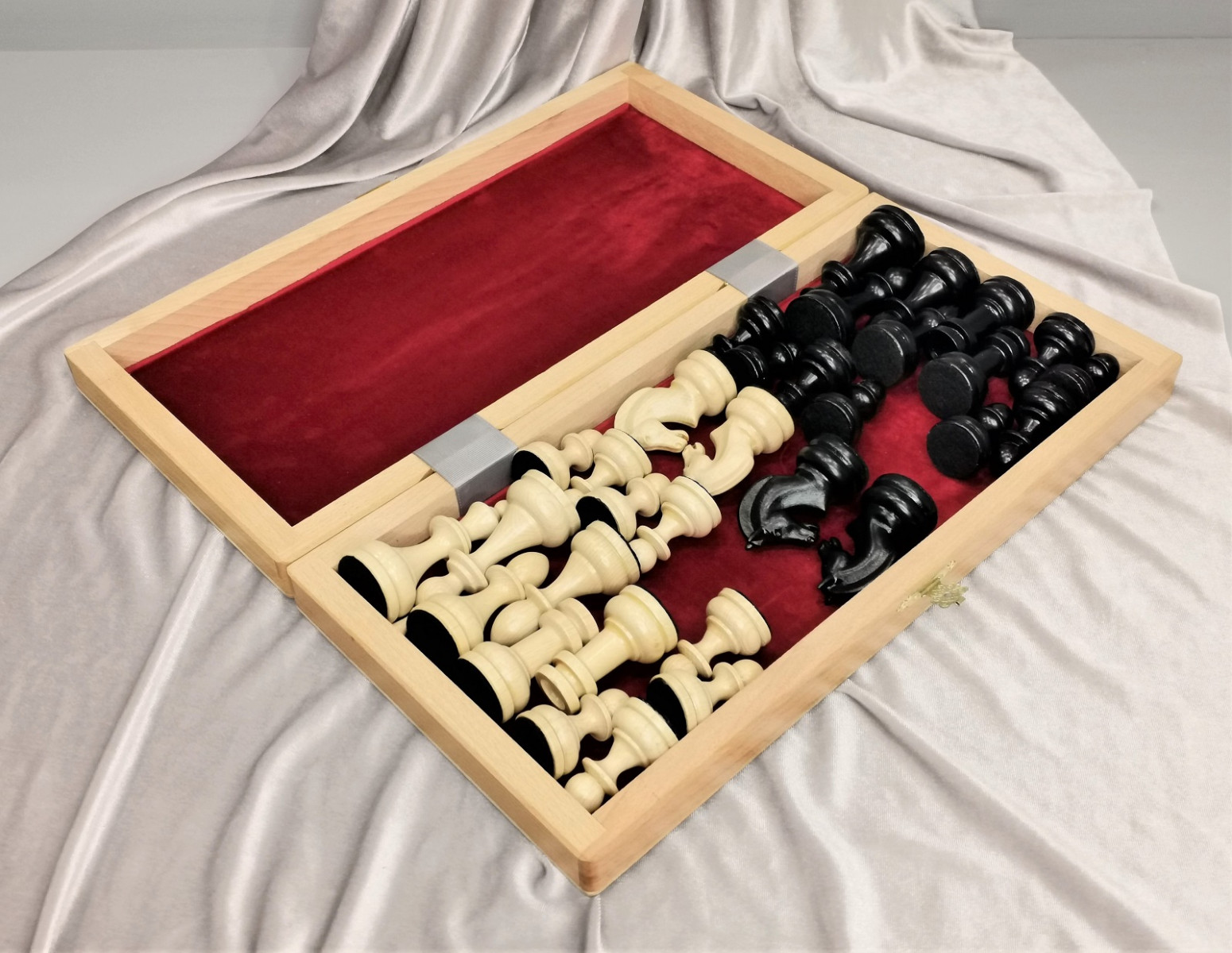Шахматные фигуры деревянные с полуматовым лаковым покрытием, исключающим блики при игре.