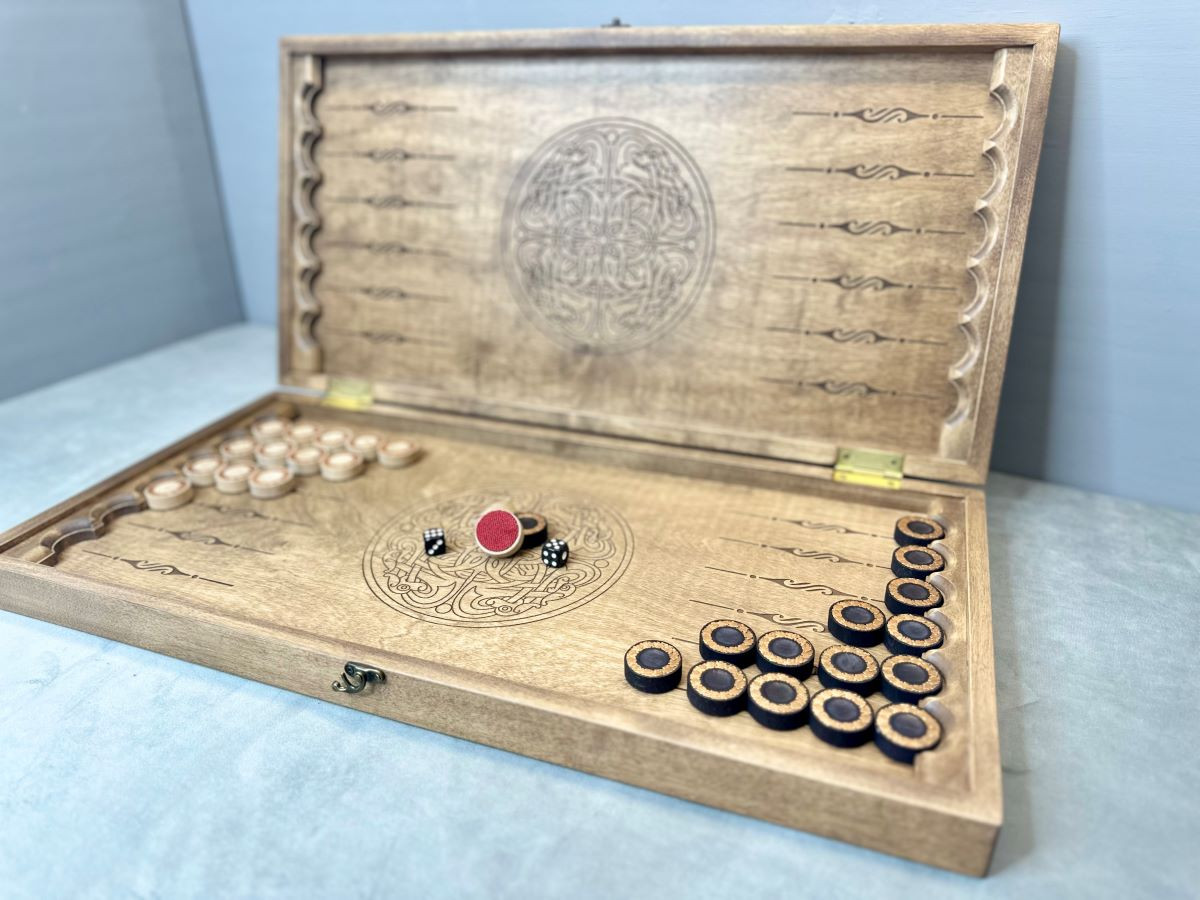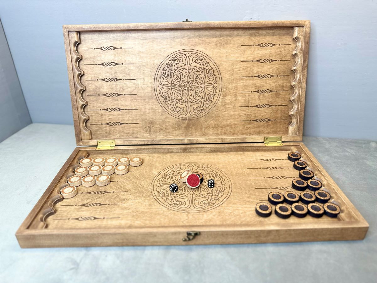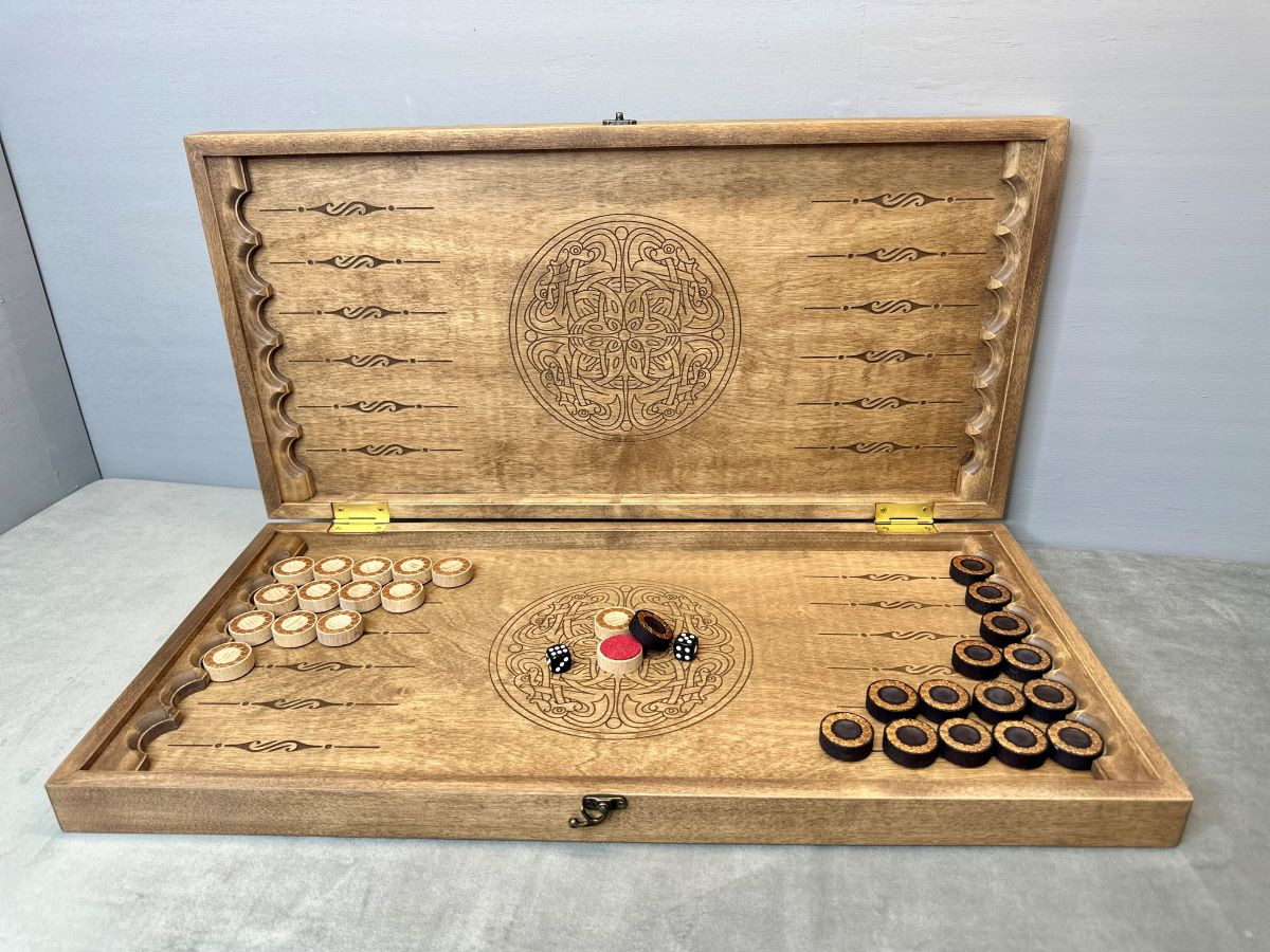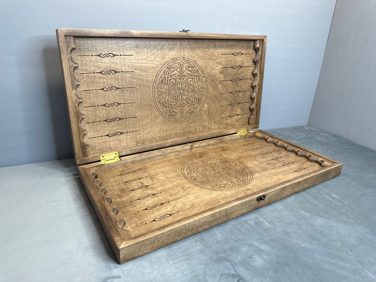 Нарды деревянные большие размером 60 х 30 см из массива ореха с фишками ручной росписи в цвете бронза, фишки с бархатной подклейкой.