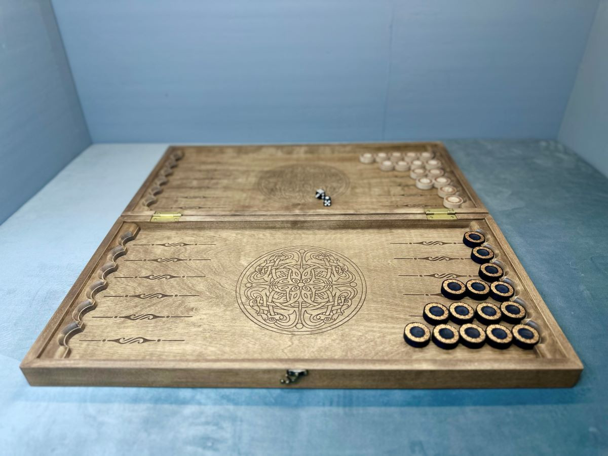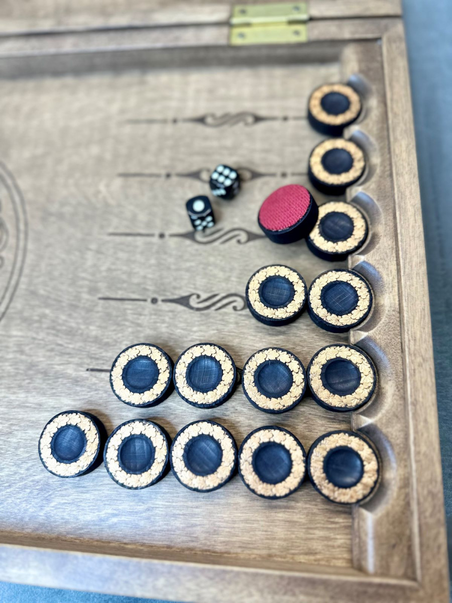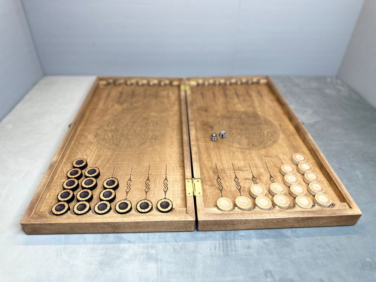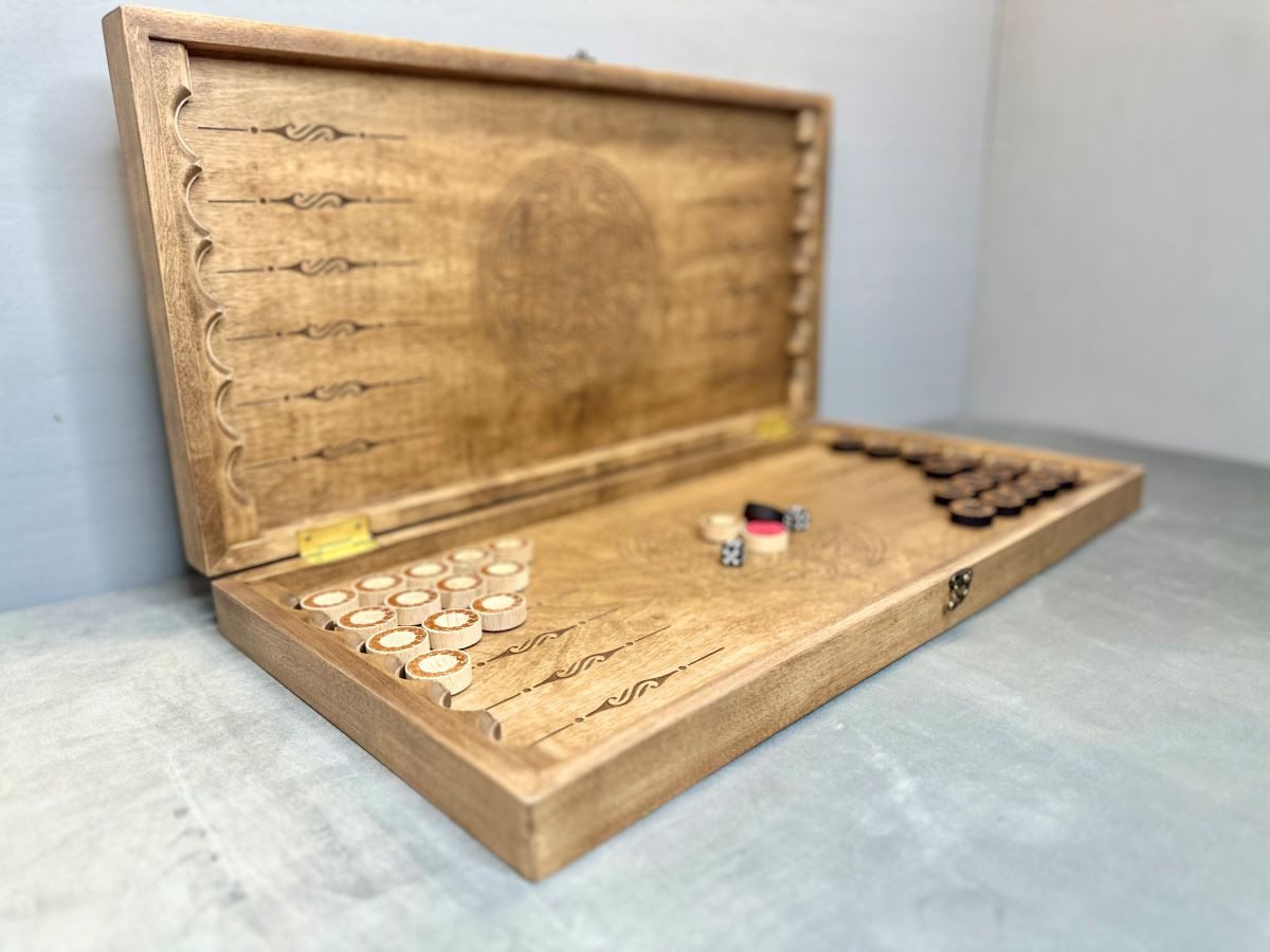 Нарды деревянные большие размером 60 х 30 см из массива ореха с фишками ручной росписи в цвете бронза, фишки с бархатной подклейкой.