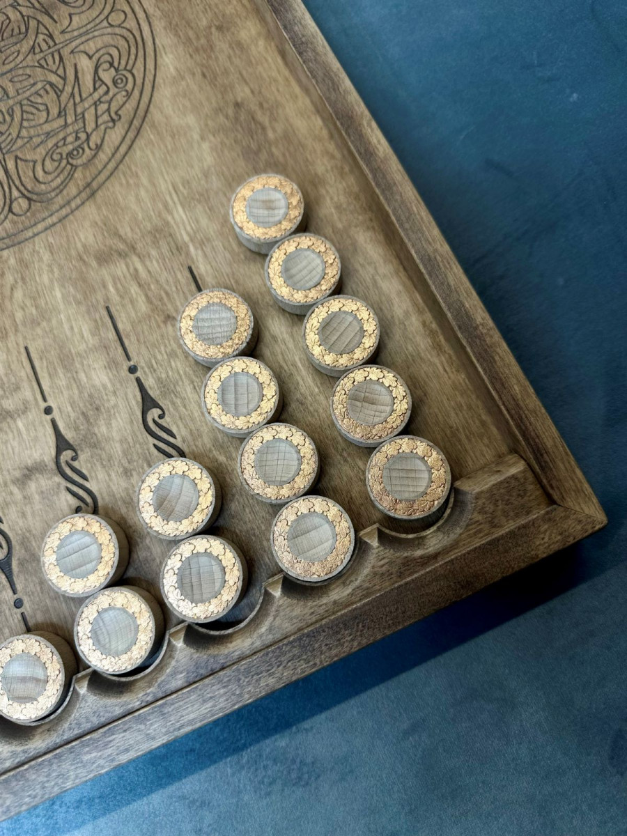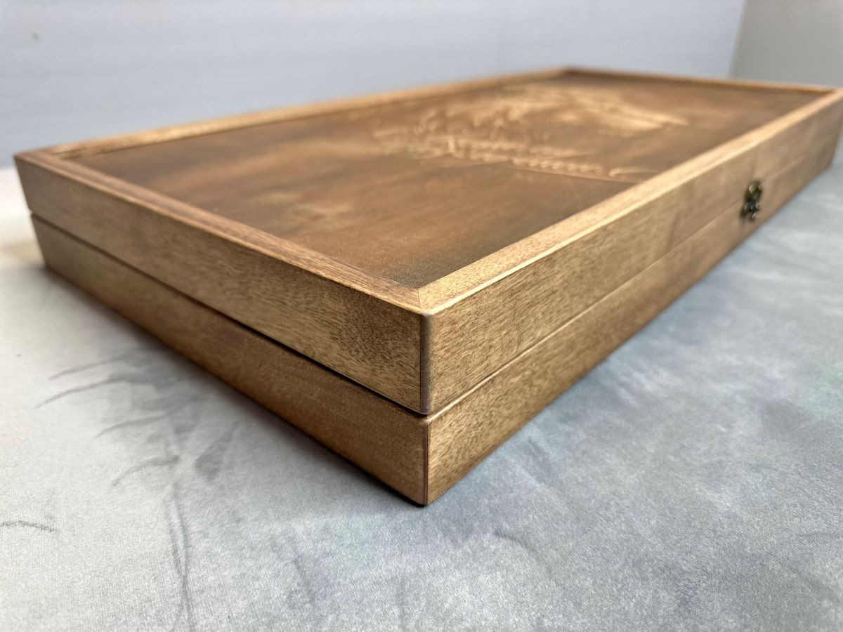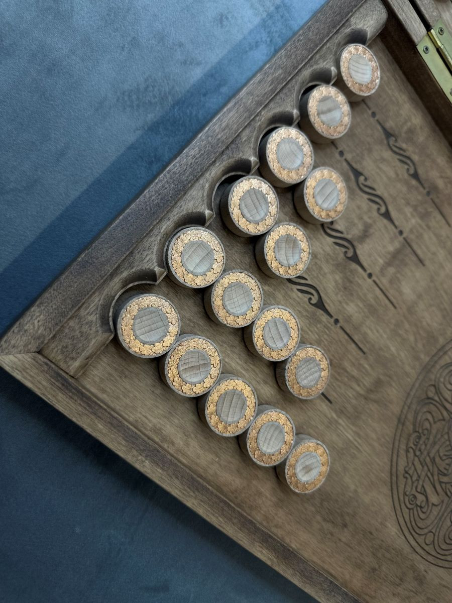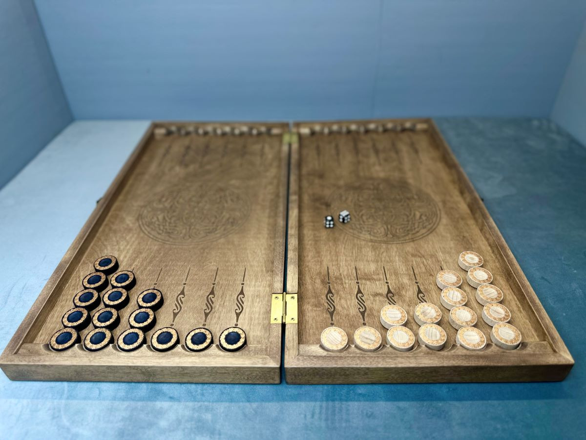 Нарды деревянные большие размером 60 х 30 см из массива ореха с фишками ручной росписи в цвете бронза, фишки с бархатной подклейкой.