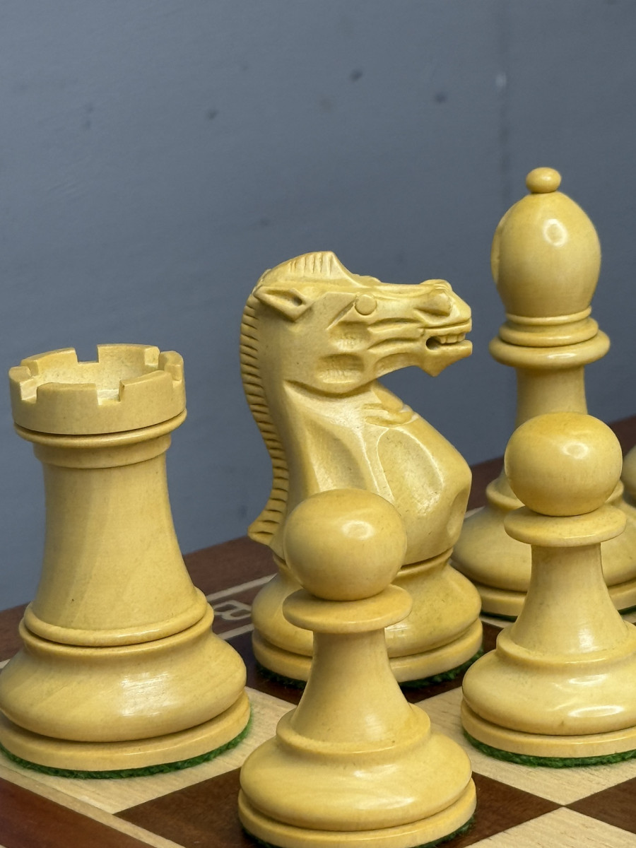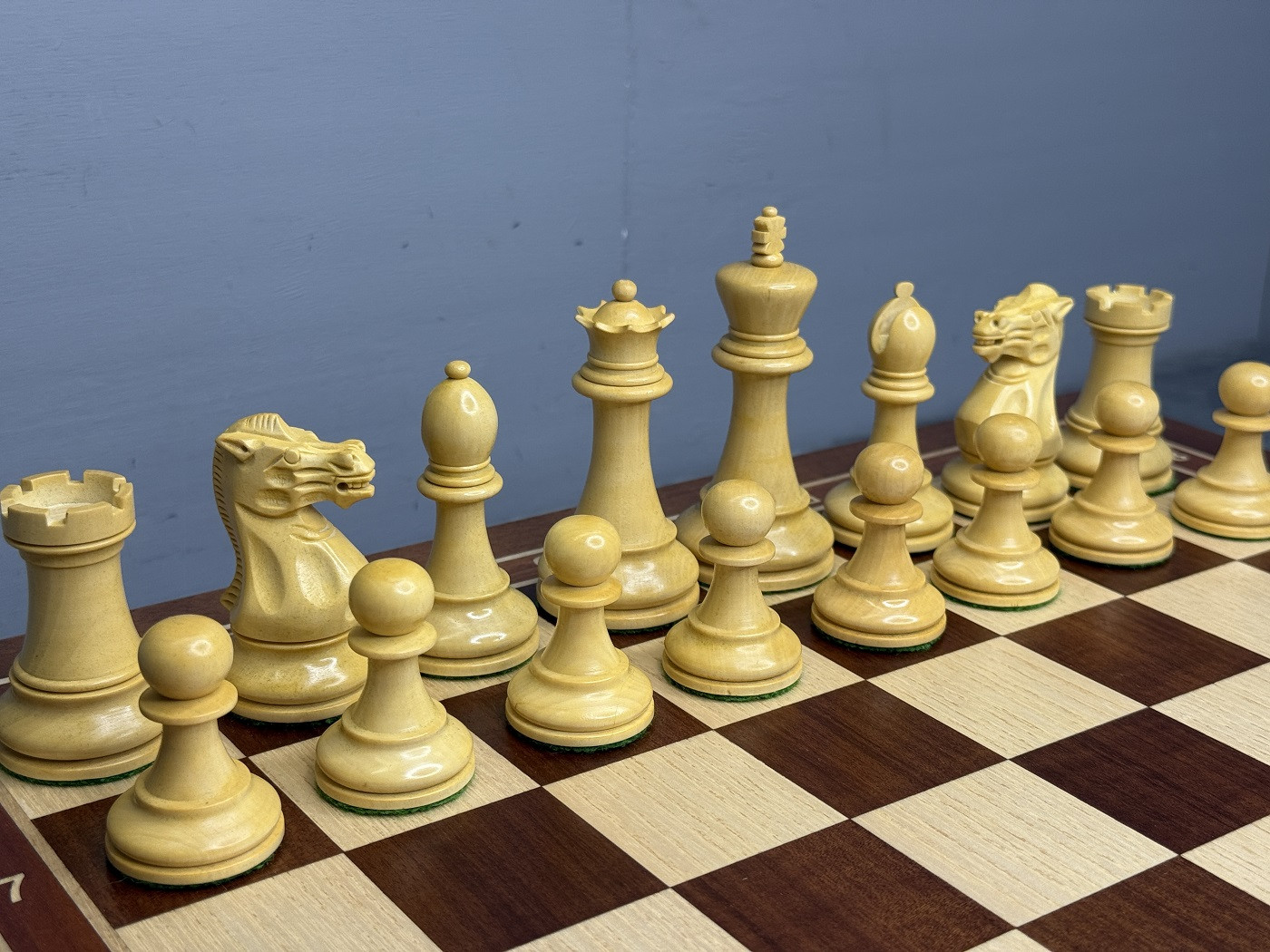 Фигуры полностью ручной работы из самшита, высота короля - 10 см, высота пешки - 5 см.