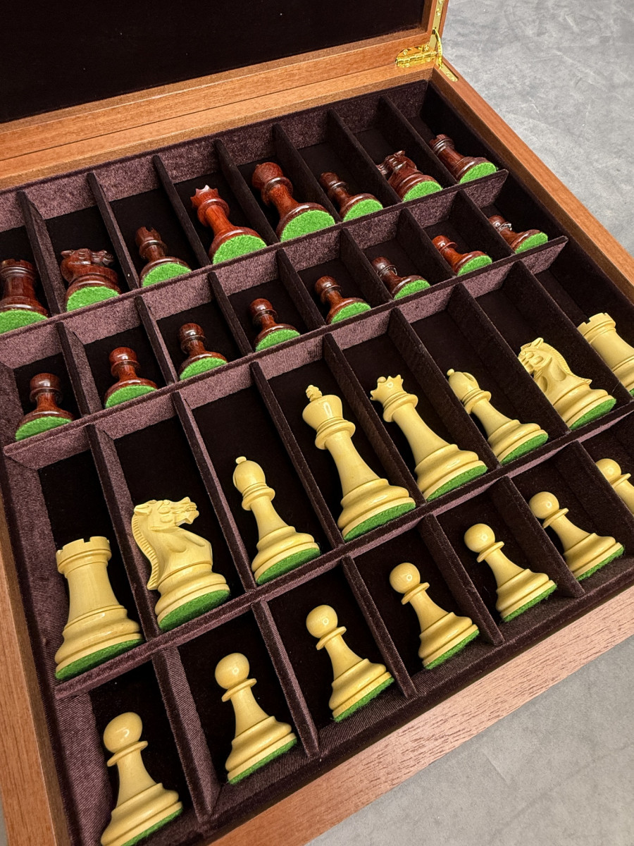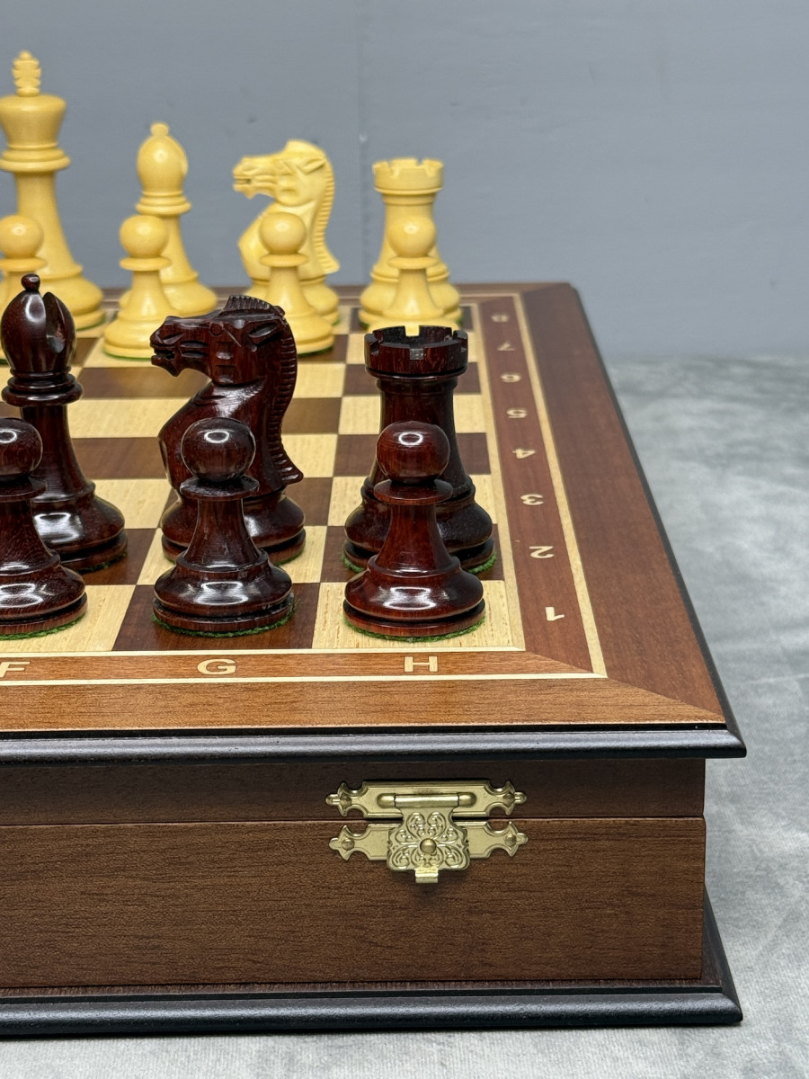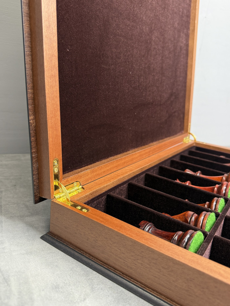 Ларец изготовлен из массива дуба. Качественная итальянская фурнитура с механизмом внутренних петель обеспечит надежное закрытие и открытие ларца без выгибаний и деформаций. Инкрустация поверхности игрового поля шпоном ценных пород американского ореха, красного дерева и клёна придаёт благородный контраст и удобство при игре.
